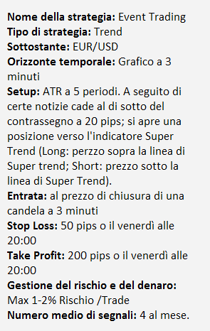 In base alle nostre osservazioni del mercato nel contesto degli eventi, abbiamo compilato un setup di indicatori che ci fornisce un indizio ogni qualvolta valga la pena fare trading sul trend in queste situazioni. Poi, abbiamo sviluppato la strategia Event Trading che suggerisce trade sistematici sul trend in seguito ad eventi “Market-Mover”.