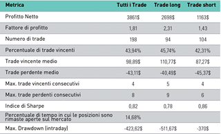 Il fattore di profitto era di 1,81 ed il numero totale di trade per il back test citato si è attestato su 198. Bisogna inoltre sottolineare che il drawdown massimo di $423 è stato relativamente basso in confronto ai risultati generali. La negatività è imputabile al fatto che la curva prestazionale della strategia di trading si è spostata lateralmente per quasi un anno.