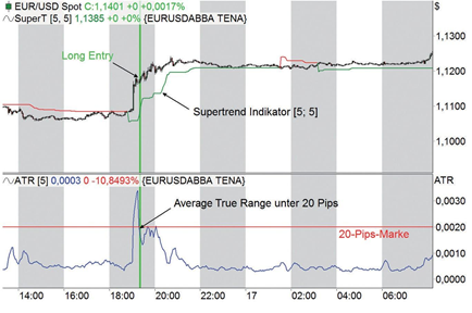 Il fattore determina quante volte la volatilità media scorre nella distanza verso il corso. L’indicatore di super trend può essere utilizzato sia come puro filtro di trend così come stop-loss o anche come sistema di trading completo. Nel nostro caso, se il prezzo si trova al di sopra della linea di Super Trend dopo che l’ATR è sceso al di sotto del contrassegno a 20 pip, si inizia un trade long. Se la coppia EUR/ USD rimane al di sotto della linea di super trend, si apre un trade short.