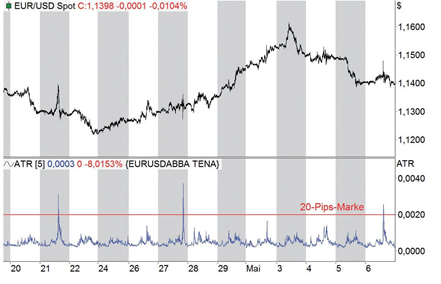 Se i trader desiderano specificatamente tradare sugli eventi, di solito danno un’occhiata al calendario economico per trovare potenziali eventi “Market-Mover”. Vogliamo intraprendere una strada diversa e catturare gli eventi sullo Average True Range indicator (ATR). L’ATR è un indicatore ampiamente utilizzato e rappresenta una misura di volatilità. In figura 1 viene mostrato il grafico a 3 minuti della coppia EUR/USD e, sulla parte inferiore, l’ATR associato per gli ultimi cinque periodi.