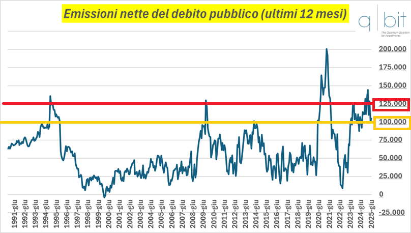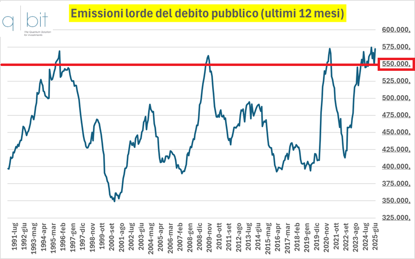 1. Le emissioni lorde degli ultimi 12 mesi, ossia il “ricorso al mercato”, sono pari a 572 miliardi di euro, sopra la soglia critica dei 550 miliardi e vicino al top di 575 miliardi. Questo è ovviamente un segnale di allarme.