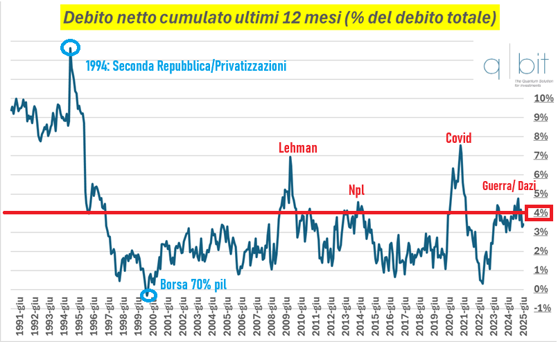 3. Analizzando le emissioni nette degli ultimi dodici mesi in percentuale del debito pubblico corrente, si nota come la prudenza nella gestione dei conti pubblici sia evidente. Tra debito in scadenza e quello rifinanziato siamo sotto la soglia del 4%, valore allarmante in passato con il top del 12,64% nel 1994, quando negli anni ’90 si rifinanziava il debito netto a tassi minimi dell’8% del debito pubblico totale. Con Lehman e la pandemia non si è andati oltre il 7,5%. La Seconda Repubblica, insieme al processo di privatizzazioni, portò addirittura il valore in negativo nel febbraio 2000 (unica volta), durante la bolla dot.com, quando le società quotate in Italia arrivarono ad un valore di mercato superiore al 70% del PIL (oggi siamo al 48% e nel 2007 a circa il 50%).
