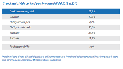 Ma osserviamo il quadro da un punto di vista più generale. Dal 2008 al giugno del 2017 il rendimento medio è stato +36,5%, mentre il Tfr si è rivalutato del +22,5%, secondo i dati oggi riportati. Dal 2012 al 2016, invece il rendimento è stato del +29,1% contro un +8,9% di rivalutazione del Tfr.