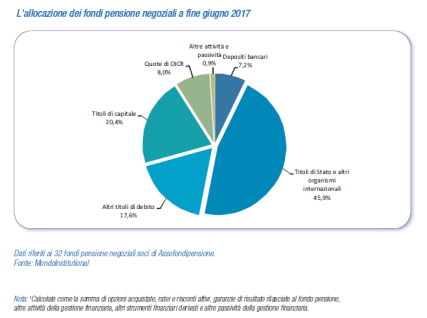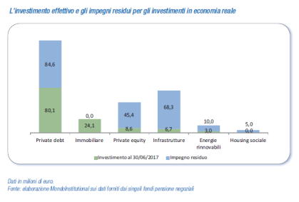 Al 30 giugno 2017 gli investimenti già effettuati attraverso strumenti specializzati in private debt, private equity, infrastrutture ed energie rinnovabili ammontava a 122,5 milioni di euro (corrispondenti allo 0,3% degli investimenti diretti e in gestione totali dei fondi pensione). L’impegno complessivo assunto è risultato di 331,7 milioni di euro, di cui 181,7 in Italia.
