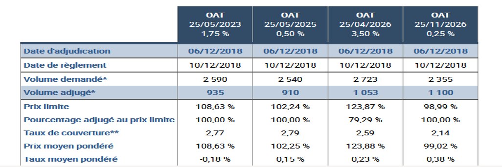 L’Agence France Tresor (AFT) ha collocato OAT (Obligations Assimilables au Trésor) con scadenze comprese tra il 2023 e il 2026 per quasi 4 miliardi di euro.