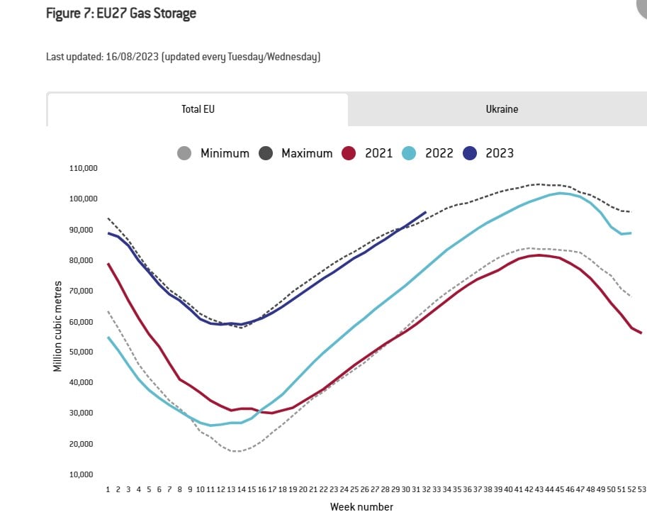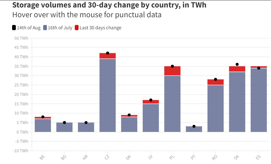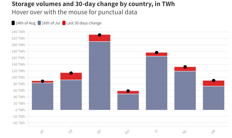 Al 16 agosto, il livello di riserve totali dell’Ue a 27 Stati è quasi al massimo per il periodo: