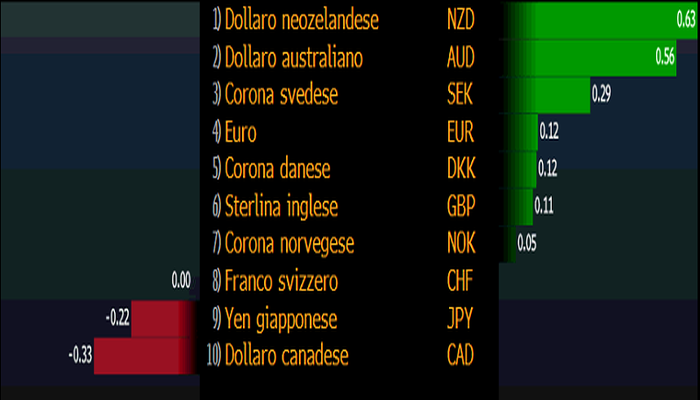 Performance delle valute del G10. Fonte: Bloomberg