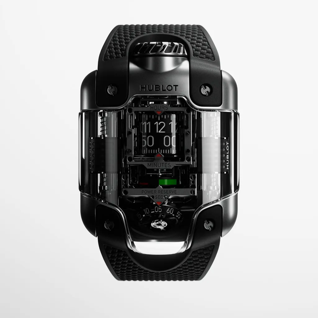 Privo di quadrante, lancette e massa oscillante (il calibro e il quadrante sono fusi), l’orologio ha un aspetto tanto radicale quanto sono le sue funzioni. Con 592 componenti, il movimento ha richiesto cinque anni di ricerca e sviluppo.