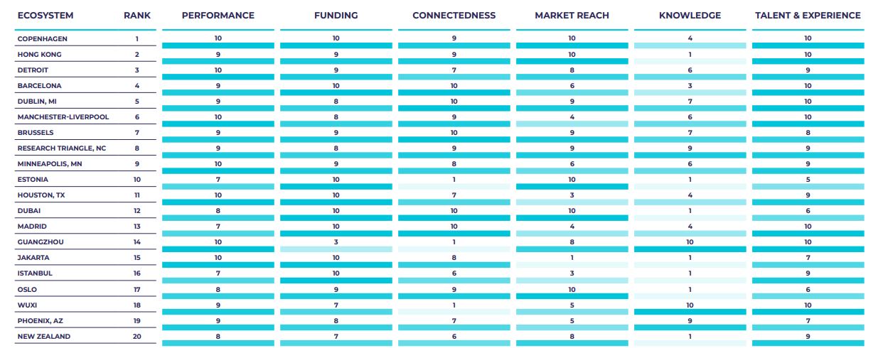 Come detto, per la valutazione di ogni ecosistema viene assegnato un punteggio da 1 a 10 a ognuno dei fattori appena elencati. Questa la classifica finale degli ecosistemi di innovazione nel 2023: