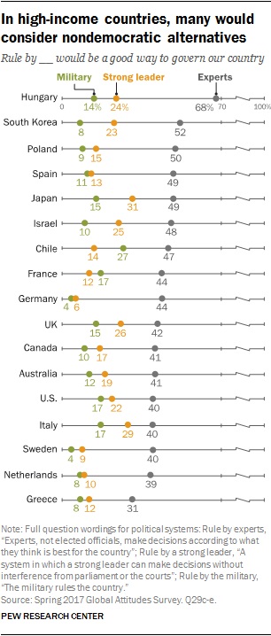 Per quanto riguarda un leader forte l’Italia con il 29% è prima in Europa e seconda soltanto al Giappone, che arriva al 31%, per quanto riguarda tutti i paesi oggetto del sondaggio di Pew Research.