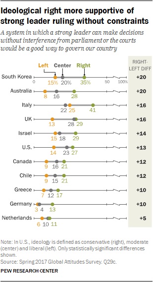Ecco dunque che in Italia il 41% degli elettori di destra sarebbe favorevole a un governo con a capo un leader forte, per quelli di sinistra la percentuale è del 25% mentre per quelli che si sono dichiarati di centro è del 22%.