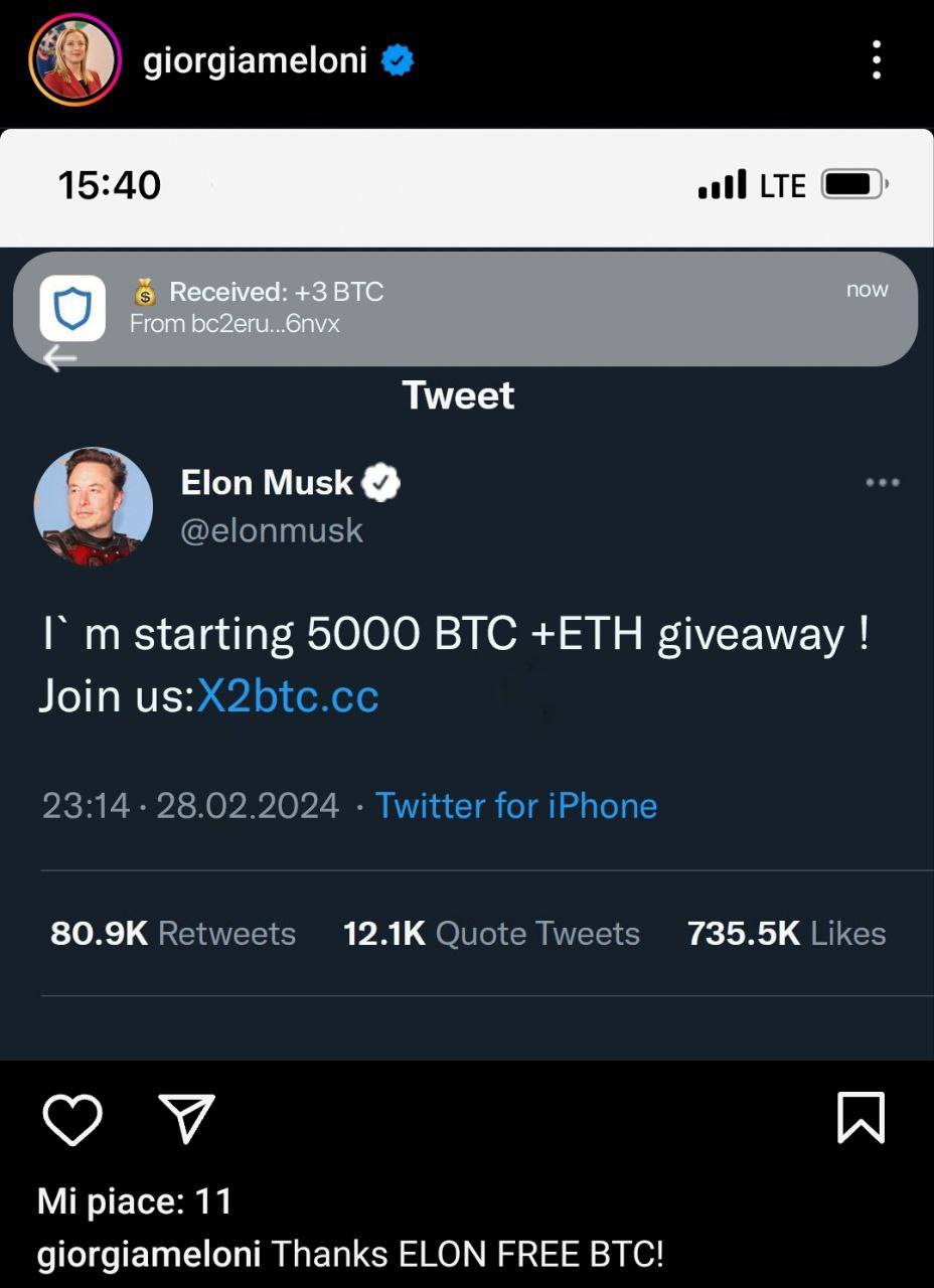 In sostanza il post faceva intendere a una presunta grossa donazione di criptovalute da parte dell’imprenditore sudafricano - seconda persona più ricca al mondo -, con Meloni che poi lo ringraziava con un commento. Naturalmente si tratta di una ben nota truffa.