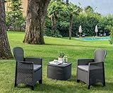 Sul mercato ce ne sono moltissimi, di diversi materiali e dimensioni. Per non spendere troppo, si può optare per il modello proposto qui. Il set da giardino è composto da 2 poltrone ed 1 tavolino contenitore reaalizzate per ottenere un effetto rattan. Le sedute sono dotate di cuscino e si presentano comode, con braccioli e schienale. Il tavolino può essere privato del piano superiore e trasformato in contenitore.