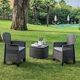 Sul mercato ce ne sono moltissimi, di diversi materiali e dimensioni. Per non spendere troppo, si può optare per il modello proposto qui. Il set da giardino è composto da 2 poltrone ed 1 tavolino contenitore reaalizzate per ottenere un effetto rattan. Le sedute sono dotate di cuscino e si presentano comode, con braccioli e schienale. Il tavolino può essere privato del piano superiore e trasformato in contenitore.