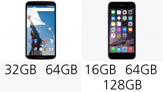 iPhone 6 Plus giunge in tre modelli da 16, 64 e 128 GB di memoria interna. Il Nexus 6 in due modelli rispettivamente da 32 e 64 GB. Nessuno dei dispositivi supporta estensione di memoria tramite card microSD.