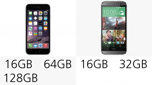iPhone 6 è disponibili nelle versioni a 16, 64 e 128GB, senza memoria espandibile. HTC One M8 in due versioni da 16 e 32 GB con memori espandibile tramite microSD.