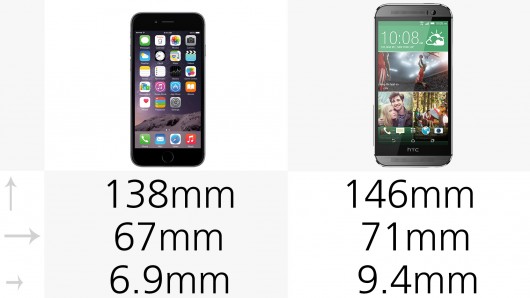 129g per iPhone 6, 160 per HTC One M8. D’altro canto l’M8 è più grande di iPhone 6 del 6 percento, coi suoi 146x71mm con 9.4mm di spessore. 138x67mm invece per l’iPhone, 6.9mm di spessore.