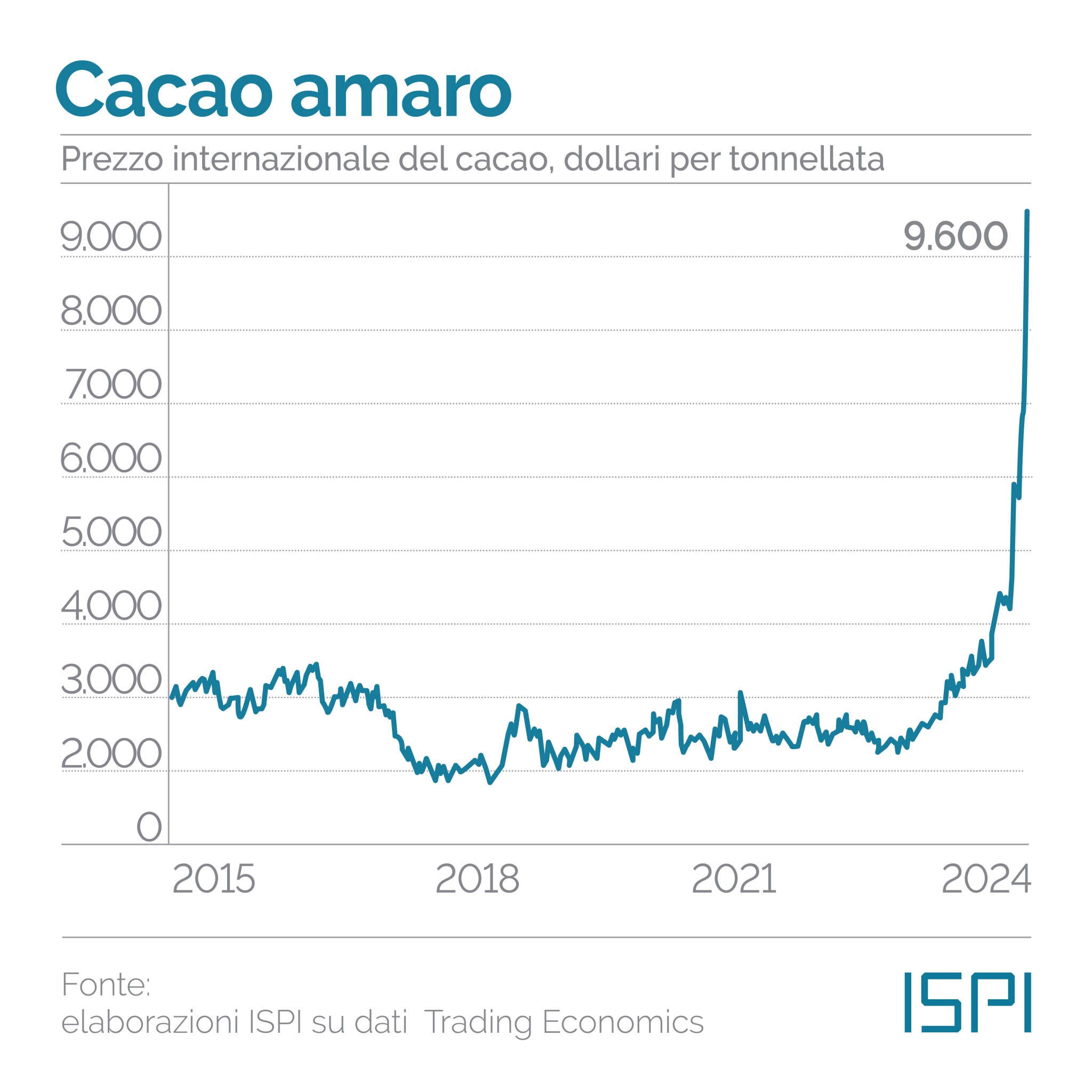 Sommando questi elementi, i prezzi del cacao si sono avviati verso i 10.000 dollari – un livello che sembrava impensabile solo pochi mesi fa – e hanno persino reso la materia prima più costosa del rame. Il grafico Ispi è eloquente nel mostrare questo balzo: