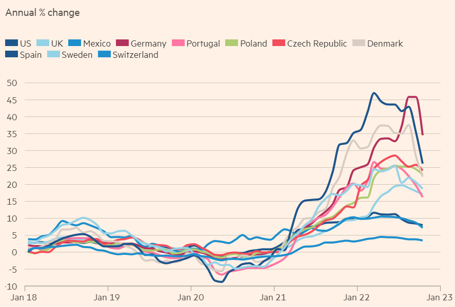 Innanzitutto, i prezzi alla fabbrica, quelli di produzione, stanno evidenziando diminuzioni un po’ ovunque. Un grafico di Financial Times, sui dati Refinitiv, lo mette in chiaro: