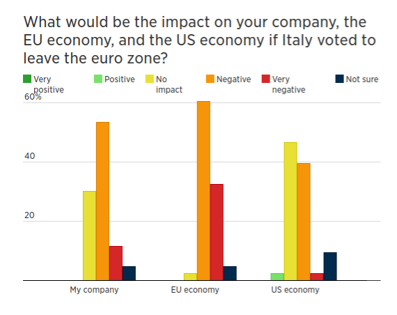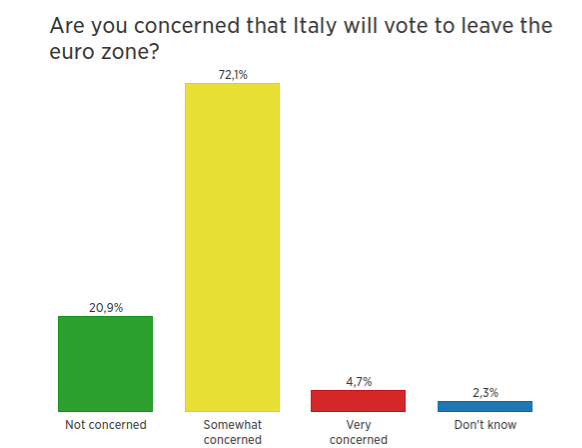 Quasi 2 intervistati su 3 si sono dichiarati un po’ preoccupati che l’Italia possa effettivamente votare un’uscita dall’euro, perché avrebbe un impatto negativo sulle loro società nei prossimi sei mesi; mentre la percentuale sale al 90% quando la domanda riguarda i timori per l’intera economia europea.