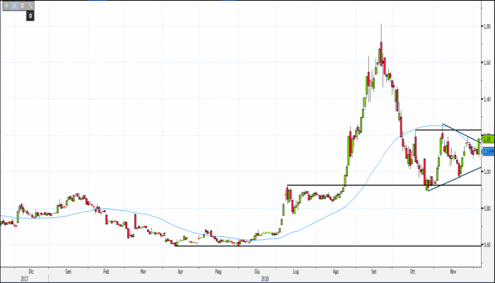 Questo duplice segnale di forza corrobora la validità del rimbalzo iniziato il 27 ottobre 2018 dal supporto di quota 0,924 euro.
