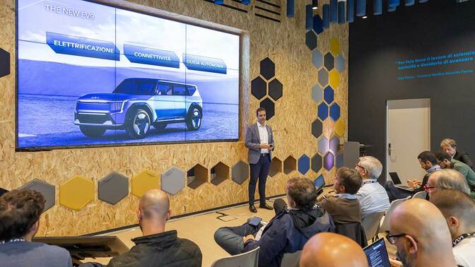 Carmelo Tringali - Product Planning Support KIA Italia: “La sostenibilità è già un tassello importante nella nostra gamma, con l’introduzione della EV9, faremo un ulteriore passo in avanti. Il nuovo SUV sarà lanciato a cavallo tra il terzo e quarto trimestre del prossimo anno, vogliamo parlarvi di un nuovo modo d’intendere la sostenibilità, diversi elementi dell’abitacolo derivano non solo dal riciclo della plastica ma anche da quella recuperata sui fondali degli oceani. La EV9 sarà l’ambasciatrice della strategia KIA, elettrificazione, connettività, guida autonoma. È la seconda vettura che debutta sulla piattaforma E-GMP, il pacco batteria è da 100 kW, in soli 6 minuti sarà possibile recuperare fino a 100 km per un’autonomia abbondantemente superiore ai 500 km. Nel classico 0-100 km/h impiegherà meno di 6 secondi, un’auto da 5 metri capace di ospitare fino a 7 passeggeri, dunque non solo versatilità ma anche innovazione legata alla connettività, per sette anni il cliente avrà i dati di navigazione inclusi, così come la copertura della garanzia. Dalla ricarica alle operazioni di manutenzione, tramite l’evoluta tecnologia di connettività sarà possibile effettuare dal pagamento alla programmazione. Il fatto di avere un sistema di connettività separato dallo smartphone sarà un elemento ulteriore di sicurezza. Con la EV9 sarà possibile aggiornare il software dell’auto e acquistare dei contenuti specifici per l’auto, attraverso l’highway driving pilot sarà possibile acquistare sistemi di sicurezza attiva di livello 3. EV9 sarà la prima auto che, normativa permettendo, potrà essere guidata senza mani sul volante.
