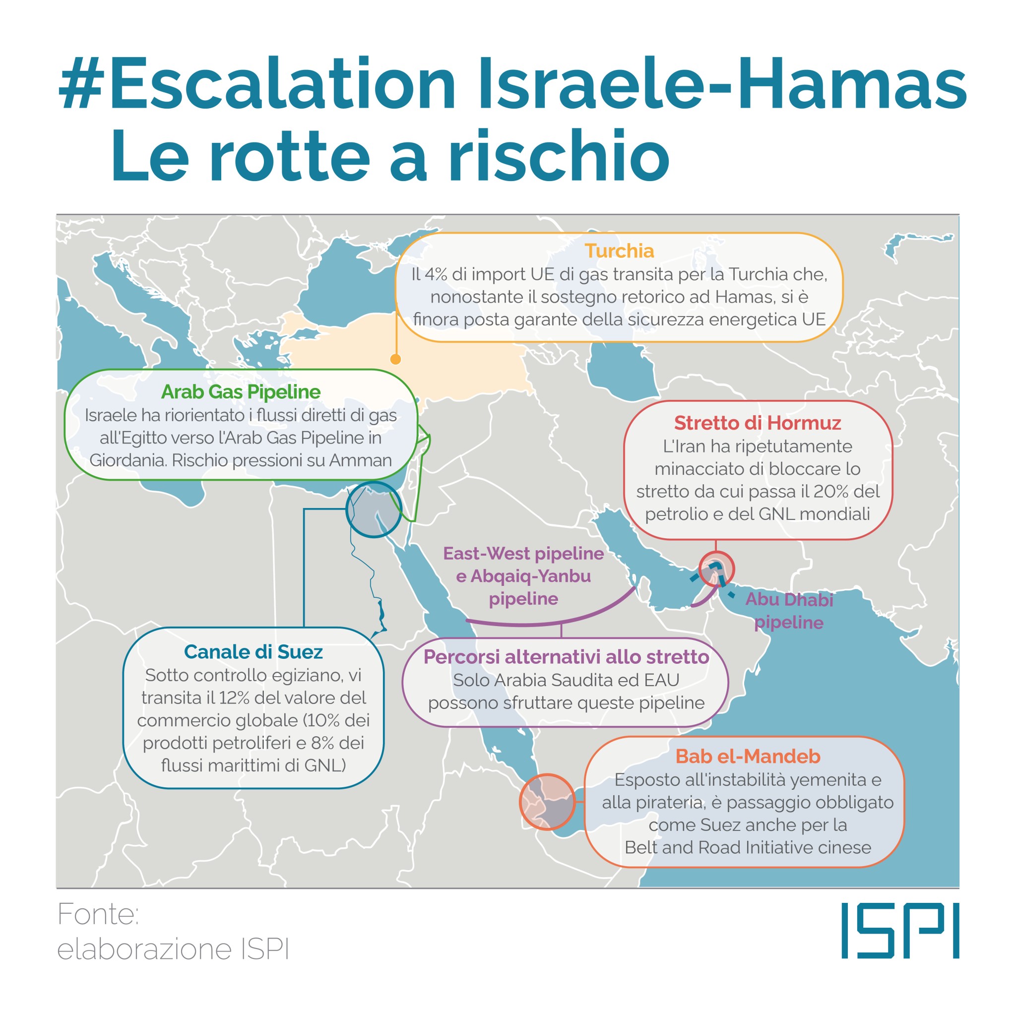 Se è vero che i mercati finora non hanno reagito con paura al conflitto, l’economia mondiale può essere ancora scossa da turbolenze. Un’analisi di Ispi ha acceso i riflettori proprio su questo aspetto del commercio a rischio che riguarda tutti. Con una mappa a segnalare le minacce di instabilità in un Medio Oriente che è vitale per le rotte mondiali.