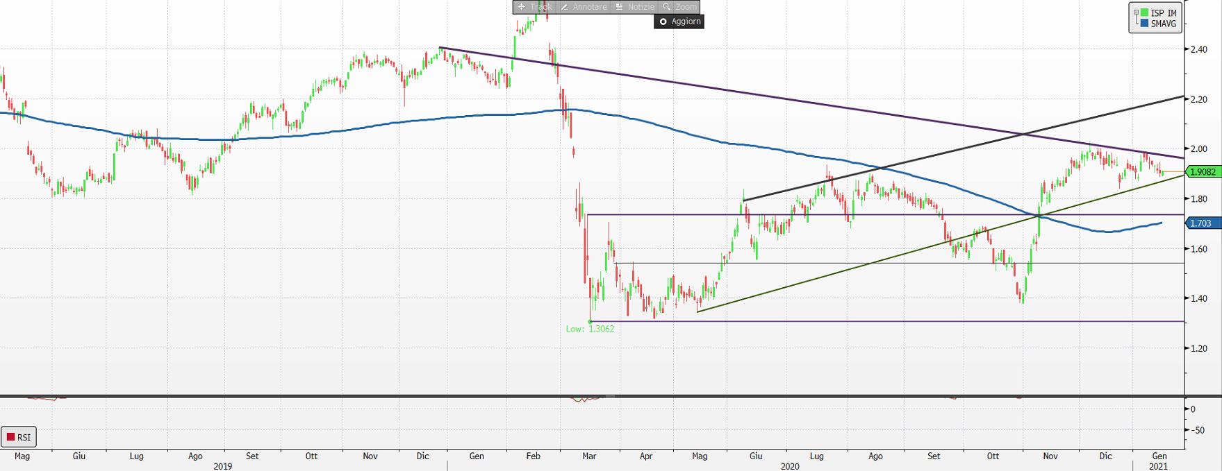 Azioni Intesa Sanpaolo, grafico giornaliero. Fonte: Bloomberg