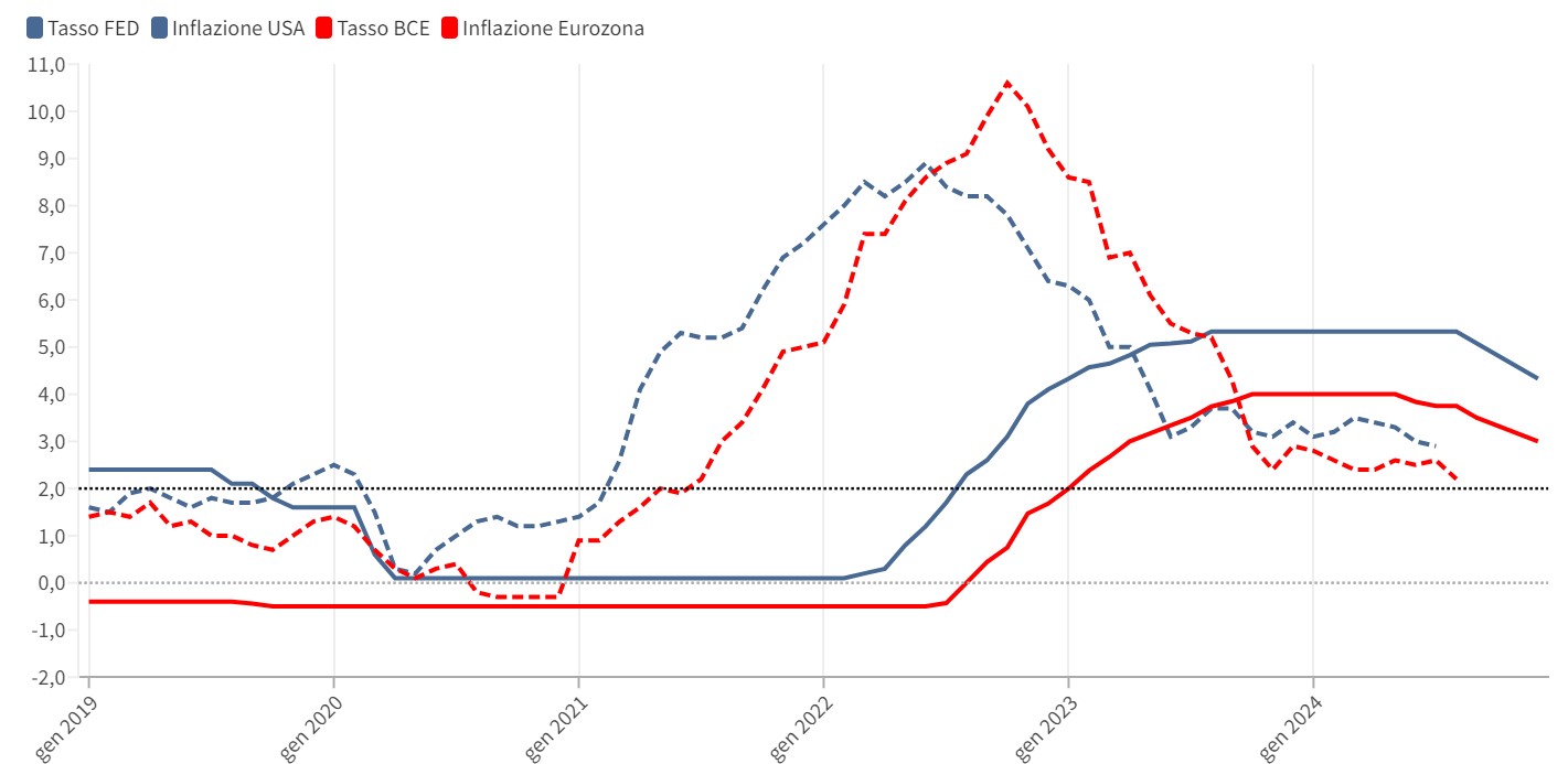 Il grafico mette a confronto la politica monetaria Bce con quella Fed, comparando il livello dei tassi di interesse e quello dell’inflazione in Eurozona e negli Usa. La banca centrale europea ha iniziato già a tagliare il costo del denaro rispetto alla Federal Reserve. I tassi di interesse dell’Eurozona, infatti, sono visti più bassi a fine 2024 rispetto a quelli Usa.