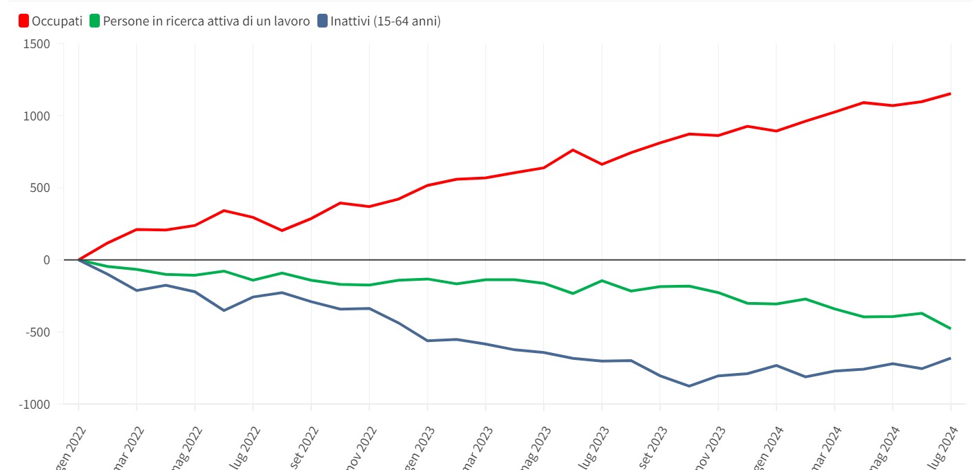 In generale, i quadro occupazionale italiano risulta positivo. Considerando gennaio 2022 mese di riferimento per la comparazione, gli occupati sono aumentati (dato rilevato in migliaia di unità). A luglio si sono aggiunti 56mila lavoratori.