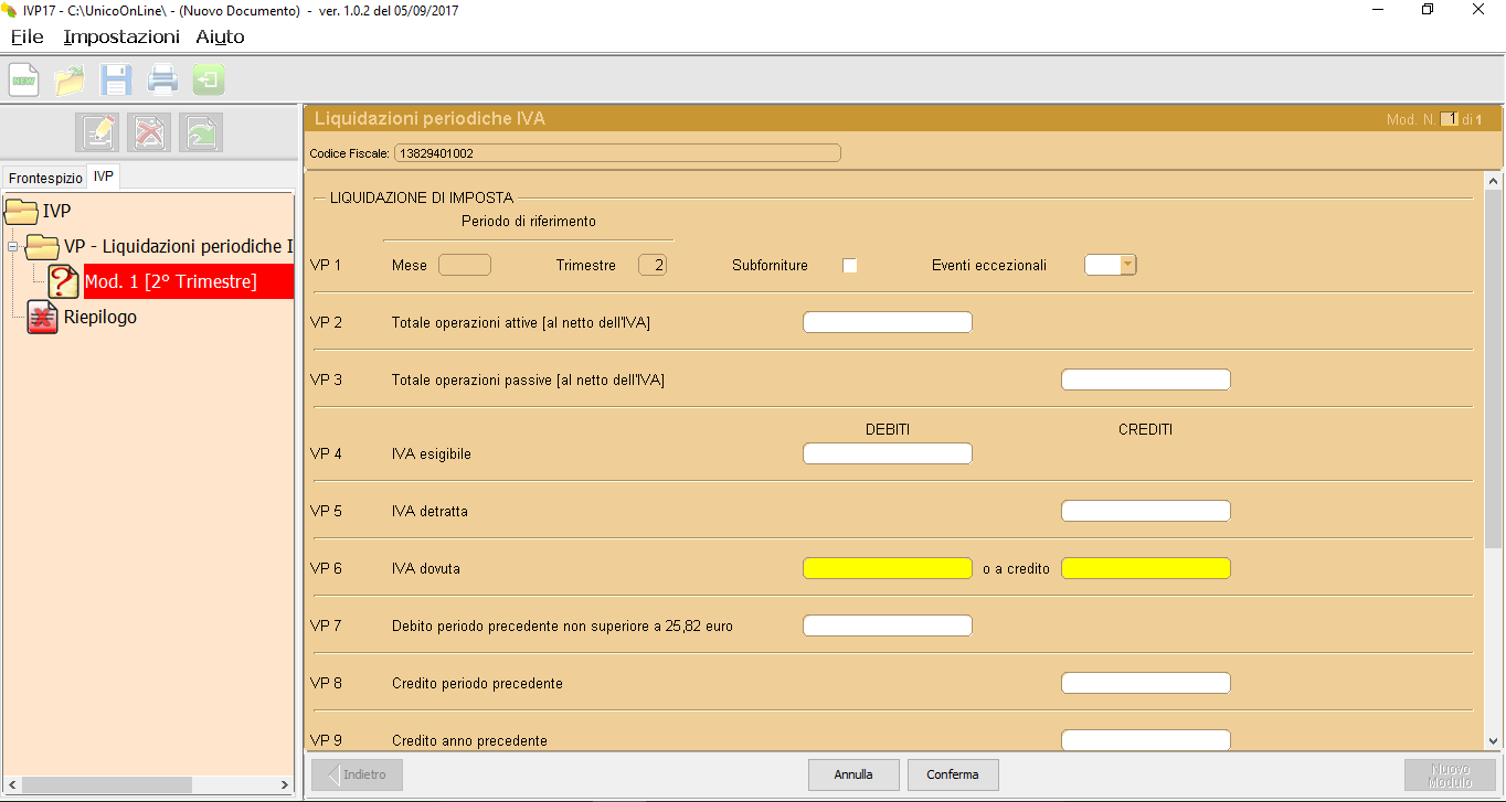 Dopo aver compilato il frontespizio occorre inserire i valori numerici relativi alla liquidazione che si sta trasmettendo all’Agenzia delle Entrate: si tratta del famoso quadro VP: