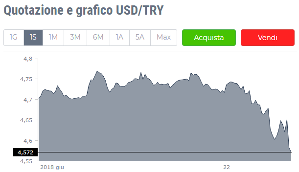 Al momento della scrittura il cambio EURTRY sta viaggiando in ribasso dell’1,73% su quota 5,36, mentre la coppia dollaro-lira turca sta scendendo dell’1,48% su quota 4,61.