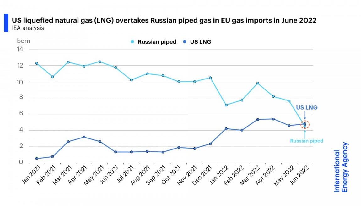 a giugno per la prima volta in assoluto nella storia, l’Europa ha importato più gas liquefatto dagli Usa che gas naturale via pipeline dalla Russia. A confermarlo, gli ultimi dati appena pubblicati dall’IEA. Un trend che ha una genesi scontata: l’aumentare delle sanzioni e del conseguente utilizzo dei flussi di gas come arma diplomatica da parte della Russia ha spinto l’Ue verso fonti alternative. E gli Usa, stante anche il rafforzamento dei rapporti Nato, sono felicemente corsi in aiuto degli alleati.