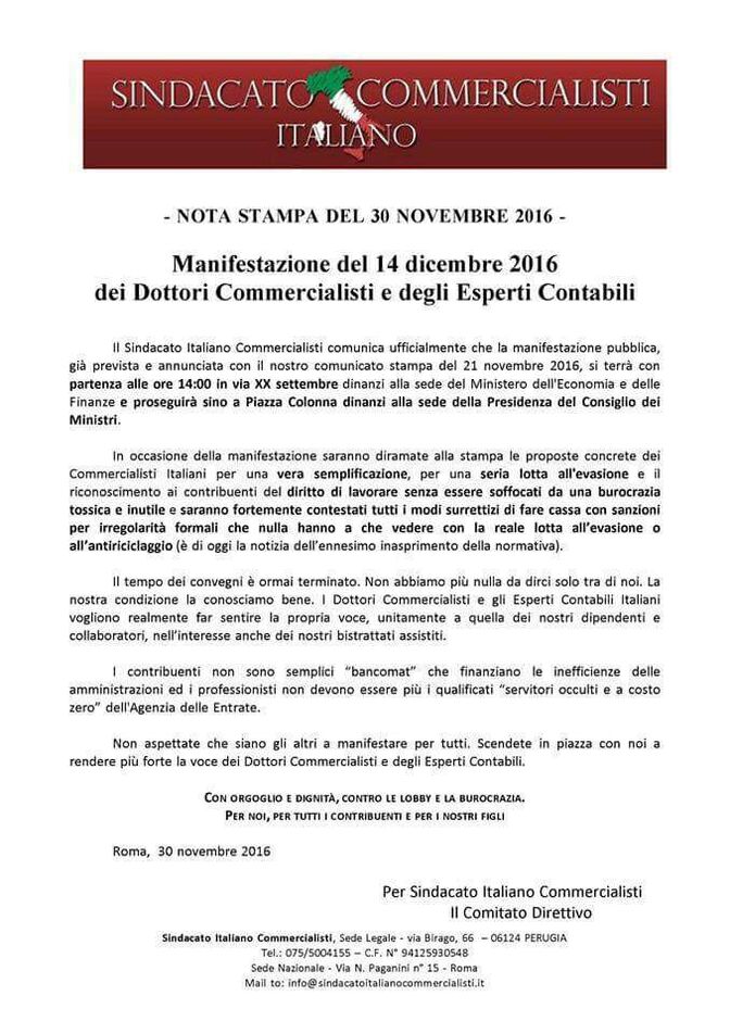 Manifestazione commercialisti 14 dicembre: il comunicato del Sindacato Italiano Commercialisti