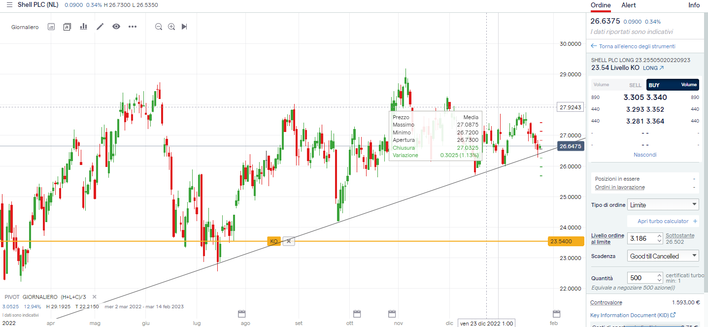 Vista la struttura tecnica dei due titoli, decidiamo dunque di investire su Shell con i Certificati Turbo24 di IG.