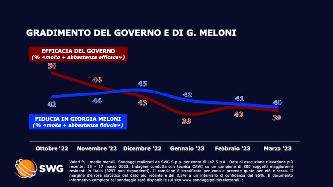 Non va di certo meglio per il governo che, dopo essere partito da un tasso di fiducia del 50% a ottobre 2022, ora sarebbe crollato al 39% dopo essere leggermente risalito nell’indagine realizzata a febbraio.