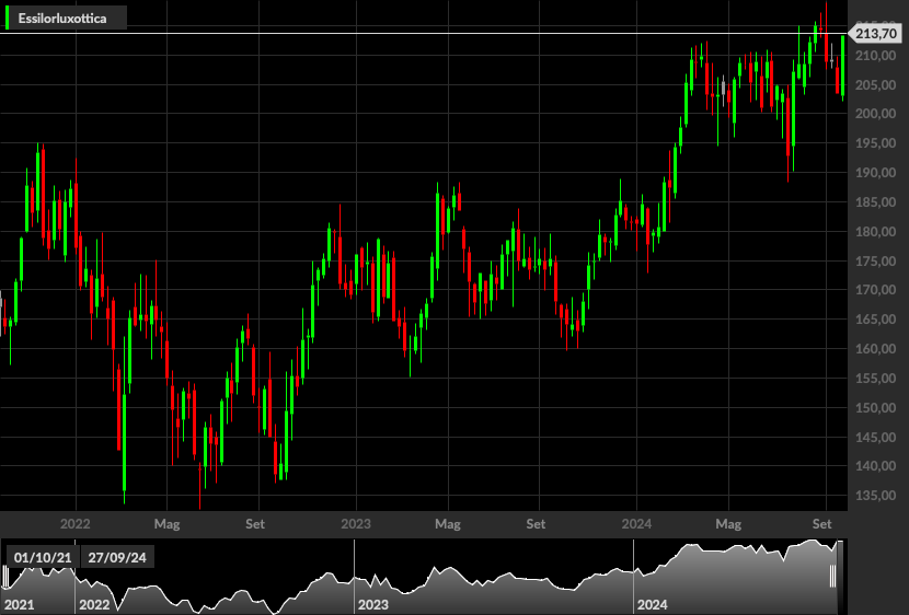 Grafico a candele del titolo Essilorluxottica. Fonte:baha.com