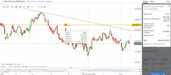 Per investire al ribasso su Microsoft interveniamo in caso di violazione di 235 dollari per obiettivi a 231 e 228 dollari. Inseriamo lo stop loss sopra 238 dollari.