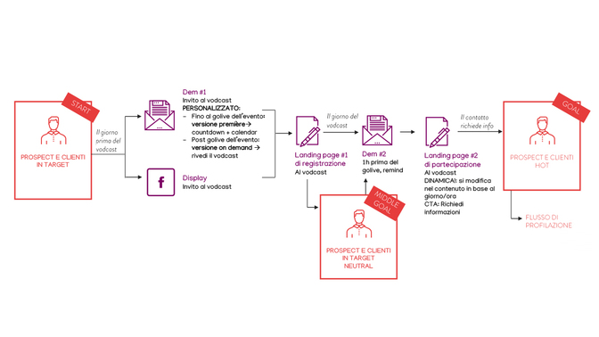 Con una sempre maggiore digitalizzazione dei servizi risulta essere sempre più importante una migrazione online degli eventi fisici dell’azienda. È infatti possibile strutturare dei precisi flussi di marketing automation multicanale al fine di permettere una gestione automatica e puntuale degli eventi in calendario, gestendo degli eventi live dal momento del loro lancio, fino a quelli di acquisizione del contatto.