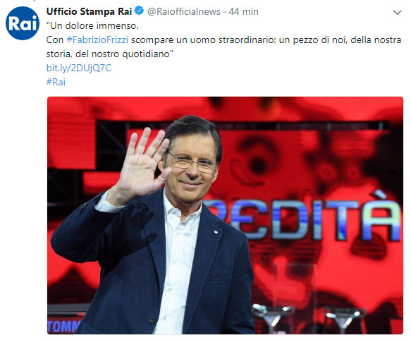 Questa notte è morto Fabrizio Frizzi - storico conduttore RAI - a causa di un’emorragia cerebrale. L’annuncio è stato dato dalla famiglia di Fabrizio Frizzi - da sua moglie Carlotta, il fratello Fabio e tutto il resto dei suoi familiari - con una nota congiunta: