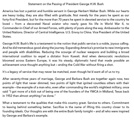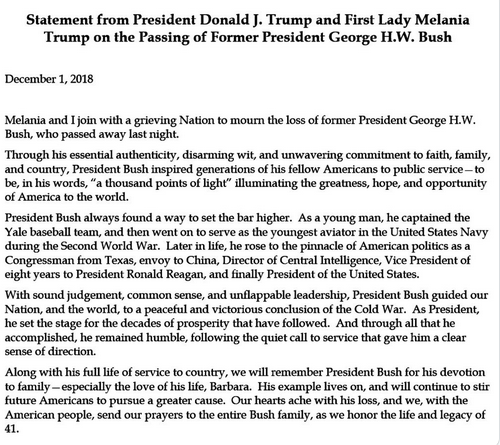 E poi Obama che esprime parole di gratitudine verso il 41° presidente e vicinanza alla sua famiglia.