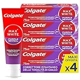 Un pack convenienza da quattro dentifrici Colgate Sbiancante Max White, in confezioni da 75 ml l’uno. Per avere sempre denti bianchi e sicuri con lo smalto, contengono fluoro e altri componenti utili.
