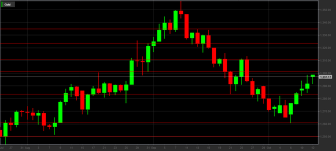 Il rally dell’oro è iniziato venerdì 6 ottobre e non si è ancora arrestato. Aveva toccato quota 1260$, minimo da due mesi, per poi arrivare nel giro di pochi giorni a 1297$, valore corrente nel momento in cui si scrive, polverizzando tutte le resistenze che aveva incontrato.