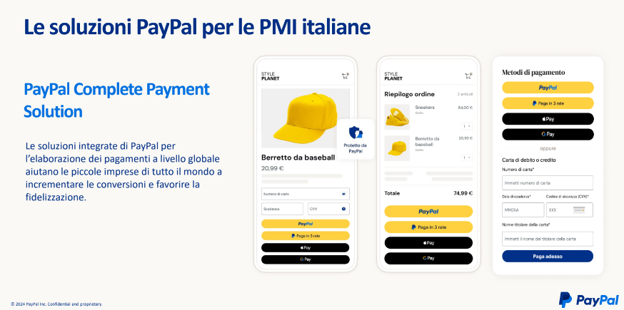 PayPal Complete Payments arriva anche in Italia, offrendo alle PMI italiane una soluzione progettata per accettare una varietà di metodi di pagamento, tra cui PayPal, Apple Pay, Google Pay, buy now pay later (paga in 3 rate di PayPal), carte di debito e credito e altre opzioni alternative. Oltre alla flessibilità nei pagamenti, PayPal Complete Payments offre protezione contro frodi e chargeback, aiutando le PMI a ridurre i rischi e a gestire le transazioni in modo più sicuro.