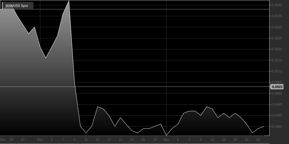 Dallo scorso novembre la banca centrale messicana ha alzato i tassi di interesse ben 3 volte e ha venduto dollari americani a investitori internazionali, il tutto per risollevare un peso praticamente schiacciato dalle minacce di Trump. La proposta del presidente di imporre gravose tariffe commerciali sui beni di importazione e la promessa di tirarsi indietro dal NAFTA hanno spinto il peso messicano ai suoi minimi storici a gennaio. Questa situazione è però durata soltanto fino alla metà del mese e da quel momento il peso messicano è tornato a rialzare la testa. Di seguito si può osservare il crollo della valuta nel giorno dell’elezione di Donald Trump.