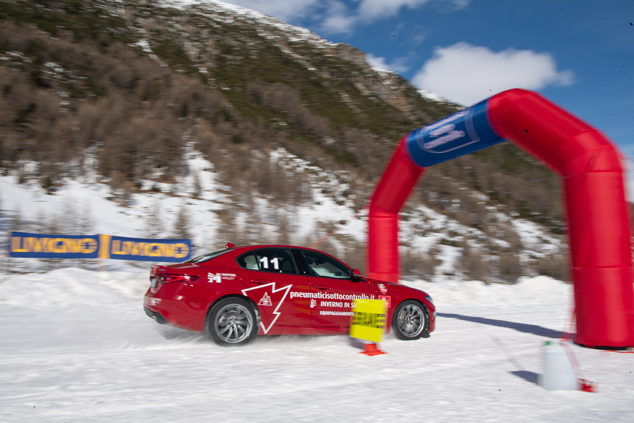 In un percorso rettilineo su fondo innevato è stata effettuata una prova di frenata con due esemplari Alfa Romeo Giulia equipaggiati rispettivamente con pneumatici invernali ed estivi. Stabilizzate le vetture ad una velocità di 40 km/h è stata effettuata una frenata d’emergenza in un punto appositamente segnalato fino ad arrivare all’arresto completo su un tratto di circa 100 metri.