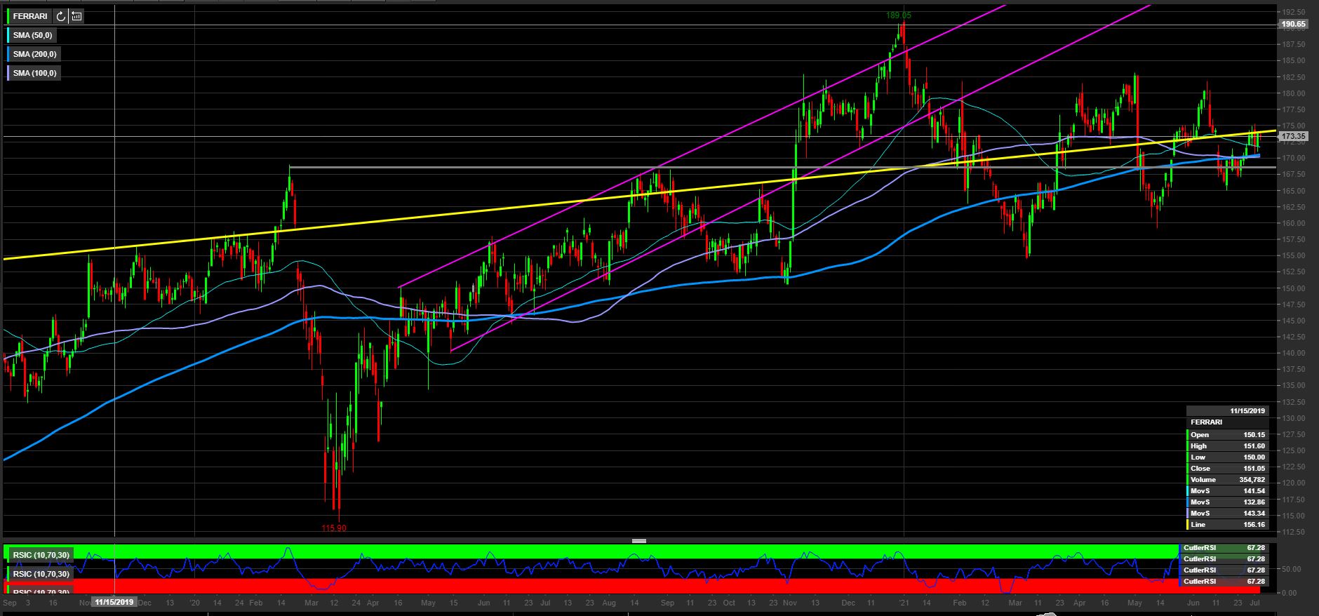 Azioni Ferrari, grafico giornaliero. Fonte: TeleTrader
