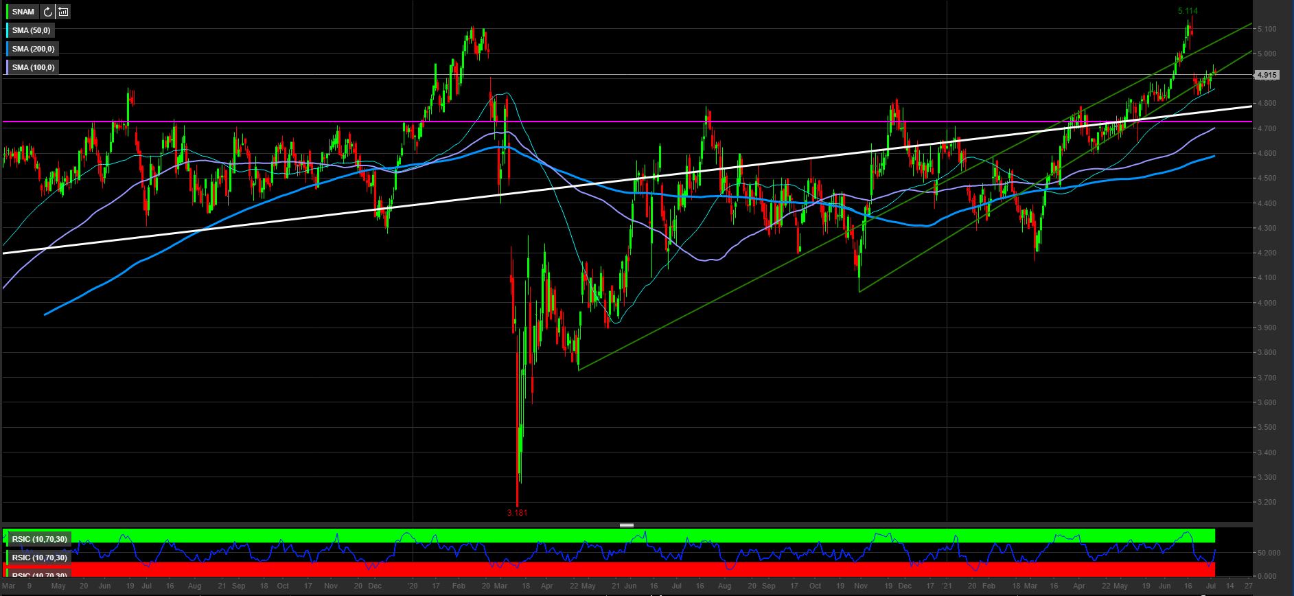 - sulle azioni Snam Rete Gas (DE000HV4D7C9), che sembrerebbe in grado di riportarsi in quota 5 euro;