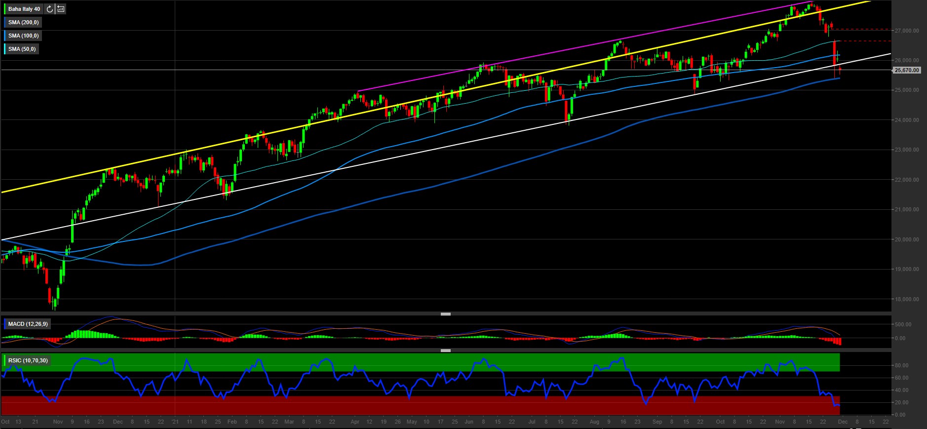 In presenta di un RSI in forte ipervenduto (14,7), ed al test della MM200, il Ftse Mib sembrerebbe avere le carte in regola per un rimbalzo dei corsi. In questo contesto, vogliamo aprire una posizione a partire da 25.450 punti con target 26.900 (nel bel mezzo del gap 25-26 novembre) e stop loss 24.600 punti.