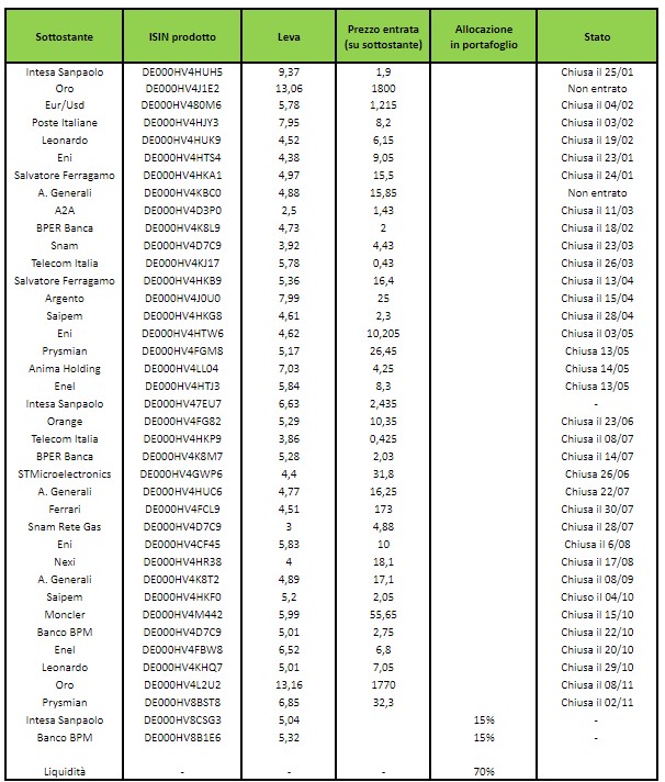 Nell’ultima settimana, entrambe le operazioni contenute nel nostro portafoglio di investimento, quella sull’oro (DE000HV4L2U2) e quella, al ribasso, sulle azioni Prysmian (DE000HV8BST8), sono state chiuse.